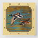 Male and female mallard ducks in flight over a golden pond, water rippling to reflect the colors of the background autumn foliage glowing in the sunlight. Accented with a sunny yellow patterned background.