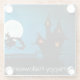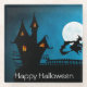 a witch flying on her broomstick past the full moon with a dark house in the background and a cat on the fence