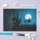 a witch flying on her broomstick past the full moon with a dark house in the background and a cat on the fence