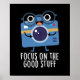 Focus On The Good Stuff Positive Camera Pun features a cute camera reminding us to focus on the good stuff. Perfect pun gift for family and friends who love cute camera puns.