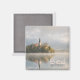 Souvenir photo magnet of a foggy sunrise at Bled Lake with the island with church and mist with reflection in the water in the first sunlight of the morning in Slovenia with the text: 'Bled, Slovenia'.
