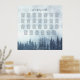 This rustic 27 table wedding seating chart features a mountain scene with a forest of blue pine trees shrouded in mist or fog. The title reads "please find your table" in elegant lacy script calligraphy. There is space for the couples' names and wedding date. This chart has table assignments for 270 guests at the traditional seating arrangement of 10 people per table.