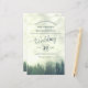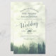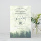 This wedding invitation is rustic and beautiful, while still being budget friendly. It features a wilderness woodland design with mountains covered in green pine trees shrouded in mist or fog. The typography features lacy script calligraphy and a sophisticated layout. Perfect for an outdoor or backyard ceremony.