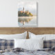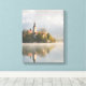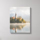 Vertical canvas landscape print of a foggy sunrise on an early morning with mist over the water and reflection in the water of the church on the island in Lake Bled, Slovenia.