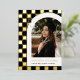 Cette faire-part moderne et unique de graduation présente une véritable feuille d'or et un arrière - plan à damiers noir qui met en évidence une photographie du diplômé encadrée dans une arche blanche avec le nom du diplômé et l'école en dessous. Un petit casquette de gradation est astucieusement affiché dans l'arrière - plan vérifié avec l'année de graduation du diplômé. Le dos a un motif assorti en blanc et noir.