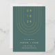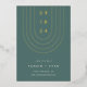 A simple and elegant save the date design for modern couples, featuring an inverted gold foil arch bearing your wedding date on a nature inspired moss green background. Personalize with your names, wedding location, and website or additional details at the bottom.