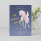 1st birthday invitation featuring a delicate unicorn with wings, stars and gold foil letters.