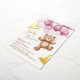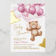 Foil Invitation for baby shower decorated with an adorable teddy bear riding balloons in the clouds.
