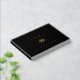 This stylish black wedding guest book, with its black and gold gold design, showcases the couple's initials in a stylish, handwritten font, encased in a decorative wire-like choker with delicate floral accents on black background. For an extra touch of elegance, the back of the guest book is printed with the couple's names in gold foil against a black background.
