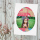 This festive holiday photo card features a large Easter egg design with a bold marble texture background. The "Happy Easter" greeting, as well as the name and date, are pressed in gold or silver foil for added elegance, and to contrast the colourful background. There is ample space for a customer photo within the egg design. The back of the card features a simple stripe pattern with the same marble texture.
