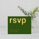 The front of this simple stylish RSVP postcard features "rsvp" lettering and a Reply-By date, in beautiful real metallic foil. The back of the RSVP postcard features stylish wording in black ink and this is where guests can indicate if they are coming to the wedding and where they can indicate their choice of meal. The back of the RSVP postcard also features the name and address where the guests can return the RSVP postcard for the wedding couple. The RSVP postcard has been designed to be quick and easy to personalize online before ordering.