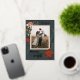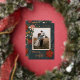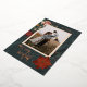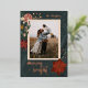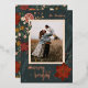 Cette carte de vacances présente une photographie unique encadrée par une bordure vintage de fleurs d'hiver et d'oranges de Noël dans une belle palette de teintes joaillières profondes acceptées par un accueil en feuille d'or rose et nom de famille.