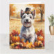 A watercolor-style painting of a cheerful dog sitting amidst a pile of vibrant fall leaves, surrounded by tiny pumpkins and scattered acorns. The dog wears a little pilgrim hat and beams with joy, capturing the spirit of Thanksgiving. In the background, soft harvest fields and golden-hued trees create a peaceful countryside ambiance. Gentle textures and warm, muted autumn tones give the scene a cozy, nostalgic feel perfect for celebrating the beauty of the season.
