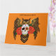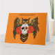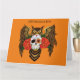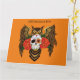 A brown great horned owl with a day of the dead sugar skull and red roses sun a backdrop of orange