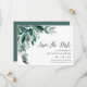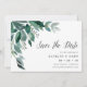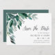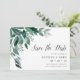 Élégant botanique enregistrer les cartes de date comprennent des feuilles d'eucalyptus d'aquarelle luxuriante et des feuillages verts en cascade du coin supérieur gauche. Customisez avec vos noms, date du mariage, emplacement et informations sur le site ou l'invitation du mariage, sous "enregistrer la date" dans le script de calligraphie chic. Cartes inversées à vert de forêt solide.