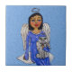 This ceramic tile has a pretty folk art angel with black hair and blue eyes wearing a blue dress with white stars hold her white and grey angel cat on her lap sitting on a white puffy cloud in a light blue sky.