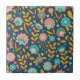 This folk art design features a pink, orange and teal floral pattern on a dark blue background.
