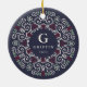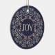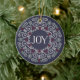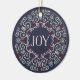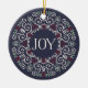 Chic and cheerful holiday design features "JOY" encircled by a folk art medallion illustration in ivory, cranberry and sage green, on a deep midnight blue background for a beautiful contrast. Ornament reverses to the same medallion design with your initial, family name and the year in the centre.