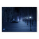 A snow-covered path meandering through the birch forest on a dark winter night. The way is lined with lampposts giving off a silvery blue glow, but in the shadows are bright, mesmerizing shapes like little fairy lights, luring the traveller off the trail. In the distance the lavender glow of some mysterious forest gathering lights up the cold sky.