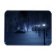 A snow-covered path meandering through the birch forest on a dark winter night. The way is lined with lampposts giving off a silvery blue glow, but in the shadows are bright, mesmerizing shapes like little fairy lights, luring the traveller off the trail. In the distance the lavender glow of some mysterious forest gathering lights up the cold sky.