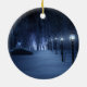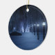 A snow-covered path meandering through the birch forest on a dark winter night. The way is lined with lampposts giving off a silvery blue glow, but in the shadows are bright, mesmerizing shapes like little fairy lights, luring the traveller off the trail. In the distance the lavender glow of some mysterious forest gathering lights up the cold sky.