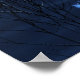 A snow-covered path meandering through the birch forest on a dark winter night. The way is lined with lampposts giving off a silvery blue glow, but in the shadows are bright, mesmerizing shapes like little fairy lights, luring the traveller off the trail. In the distance the lavender glow of some mysterious forest gathering lights up the cold sky.