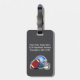 A quality luggage tag that expresses your interest in the sport of Football. The design features an artistic rendering of a football next to a player's helmet on a dark grey background. The name and address text is easily changed by using the template. If other changes are desired (different type font, size, colour, or placement OR to resize or rearrange the football/helmet image) select "Personalize this design" then select "Edit using Design Tool." You can also use the Design Tool to select your own choice of a background colour. Note: The design appears on both sides, so check to be sure both sides have been edited properly before ordering.