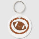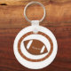 A brown leather football featured in a brown circle accented by white lines on a white background.