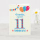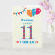 A colorful birthday card for an 11-year-old cousin, The large number 11 filled with an orange, red and blue pattern, outlined in bright blue. There are balloons and bunting at the top, in matching colors and the front cover greeting is, 'Cousin, you're 11 today!' in bright red and blue lettering, on a very pale yellow and white polka dot background, with red and orange stars each side of the word 'TODAY!'. The inside message can easily be customized or deleted if you wish.