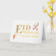 A stylish greeting card for your father, with decorative lettering outline in gold-effect and filled with brightly colored islamic patterns. The front cover greeting is, 'Eid Mubarak. to my dear Father!' There is a brightly colored lantern in the bottom left corner, hanging underneath the letter 'E' and a patterned moon and star in the top right hand corner, with two more lanterns and an Islamic Star suspended from the moon. The white background on the front cover is lightly textured and the inside message is just a suggestion which you can easily change or delete if you wish.