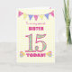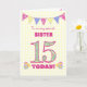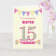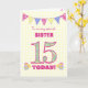 A pretty 15th Birthday card for your sister, with polka dot bunting, primrose flowers and numbers filled with a primrose pattern, all on a pale yellow check gingham background. The front cover message is, 'To a very special SISTER 15 TODAY!' The inside message is just a suggestion and you can easily personalise it or delete it if you prefer.