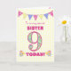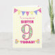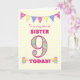 A pretty 9th Birthday card for your sister, with polka dot bunting, primrose flowers and numbers filled with a primrose pattern, all on a pale yellow check gingham background. The front cover message is, 'To a very special SISTER 9 TODAY!' The inside message is just a suggestion and you can easily personalize it or delete it if you prefer.