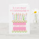 A very pretty birthday card for your step daughter with a pink birthday cake with lots of patterned candles. The cake is pink, with a polka dot pattern and decorated with clusters of pink, Albertine roses, painted by hand in watercolour. 'Happy Birthday!' is written in matching pink on a white band around the cake. Above the candles, it says, 'To a very special STEPDAUGHTER with a tiny pink heart at each end of the word, 'STEPDAUGHTER'. The inside message is just a suggestion and you can easily edit it or remove it, if you wish.