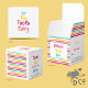 A simple candy-striped pattern, to give it a colourful, pop of colour. "For the Tooth Fairy" on the top, personalized name and thank you, blank spaces to handwrite and fill in, which tooth fell off and to date it, messages for tooth fairy... all the sides filled with fun, adorable cuteness. Interactive, engaging and loads of fun.