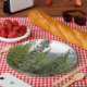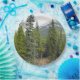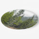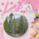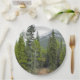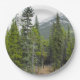 This paper plate design features a photo of a forest scene with coniferous trees, along with a mountain in the background.