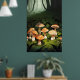 A cluster of vibrant orange and white mushrooms with white spots stand in a lush green forest setting. The mushrooms are arranged in a semi-circle, with their caps tilted towards the viewer. The forest floor is covered in a carpet of green leaves and moss, with tall, dark trees looming in the background. The air is thick with mist, creating a sense of mystery and enchantment.
