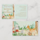 "Forest Animals Deer Owl Woodland Book Request Enclosure Card." Book Request Enclosure cards for a gender neutral shower, has a pale pastel sage green background and a woodland forest scene that was painted in watercolors. A baby Deer, owl, hedgehog and bunny are surrounded by ferns, red mushrooms and oak trees. These cards come in a pack of 100. All artwork was painted by internationally licensed artist and designer, Audrey Jeanne Roberts, copyright.