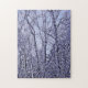 This digitalized, graphic photo, of a bare, wooded forest, is displayed in muted, colours of, violet, purple, blue, white, grey, and black-cast in the lingering traces, of a pale-blue, twilight.