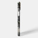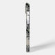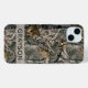 Customize this forest branches camouflage iPhone 15 plus case with your name in a trendy modern CAP font in gray on opaque cream. It's masculine and perfect for your favorite military, hunting, country or outdoorsman!