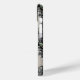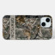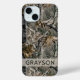 Customize this forest branches camouflage iPhone 15 case with your name in a trendy modern CAP font in gray on opaque cream. It's masculine and perfect for your favorite military, hunting, country or outdoorsman!