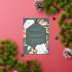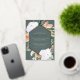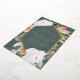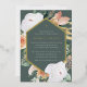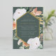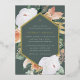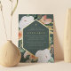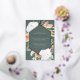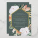 Elegant floral baptism invitation features an elongated hexagonal frame of watercolor flowers and foliage in boho desert inspired shades of peach, white, ivory, and sage green, and finished with gold foil trim on a mossy forest green background. Personalize with your church baptism ceremony and party details in classic serif lettering.