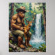 This heartwarming artwork features Bigfoot, a large, hairy creature wearing a cowboy hat and pants, gently petting a young deer fawn. They are seated on a mossy log near a flowing waterfall in a lush green forest. Sunlight filters through the trees, creating dappled light on the scene. The painting's thick, textured brushstrokes give a whimsical and tender feel to this unexpected friendship in the wilderness.