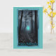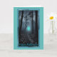 This atmospheric Halloween card captures the eerie stillness of a foggy forest path, illuminated by a mysterious blue glow in the distance. The tall, shadowy trees create a sense of foreboding as they tower over the darkened trail, leading the viewer's eye toward the ethereal light that beckons from the depths of the woods. The card's design is framed with a subtle, teal border that complements the cool, ghostly tones of the scene.
