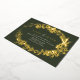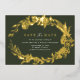 Formal save the date cards featuring real metallic foil. Vintage-style florals frame your details. Gold on a contrasting dark green background.