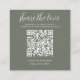 Forest green share the love QR Code cards. Place these small cards at your wedding reception tables so guests can scan to upload the photos they took at your wedding reception to your album or social media. To generate a new QR code on the design, add the URL of your online wedding album or social media handle in the area provided, using the "personalize" feature. A brand new QR code will then be added to to the design.