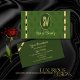 YOUR FAVORITE - Make a lasting impression with this elegant and luxury business card design featuring shimmery golden decor borders and oval frame. On the front matching monogram pattern on a forest green background and the back is dark forest green.