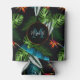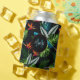 A chic black background. Green and blue tropical rain forest, jungle. Palm tree and banana leaves, foliage with red and orange florals, flowers. A black and orange frame with space for your name and monogram letter. The name is written with a modern hand lettered style script.