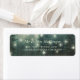 Rustic address label with spruce trees decorated with fairy lights.