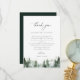 Elegant watercolor forest pine trees, Wedding reception thank you table card. Template provides multiple lines for your custom thank you message. Features, black typography on coordinating green and white backgrounds.