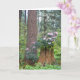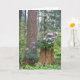 A thoughtful retirement greeting card that features the photo image of a peaceful, evergreen forest with lovely, pink Rhododendron flowers growing on a tree stump. Select your greeting card paper type.